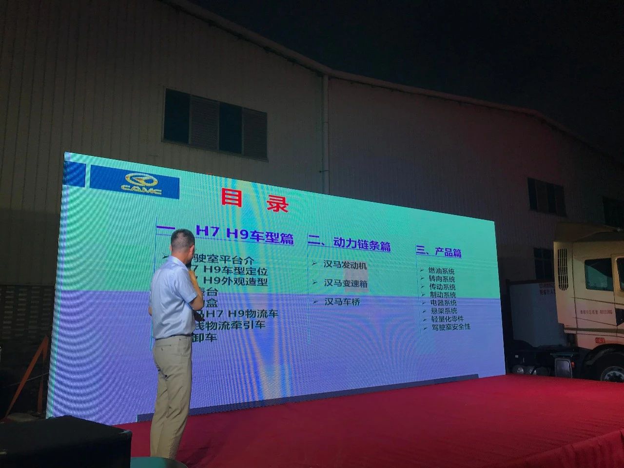 H7/H9車型特點(全新豪華內(nèi)飾,外觀造型的對比,全新多功能儀表盤),漢馬動力鏈(高可靠性、低轉速、大扭矩、高安全性、高燃油經(jīng)濟性;漢馬變速箱的優(yōu)勢;漢馬車橋的組成)以及產(chǎn)品篇的講解。
