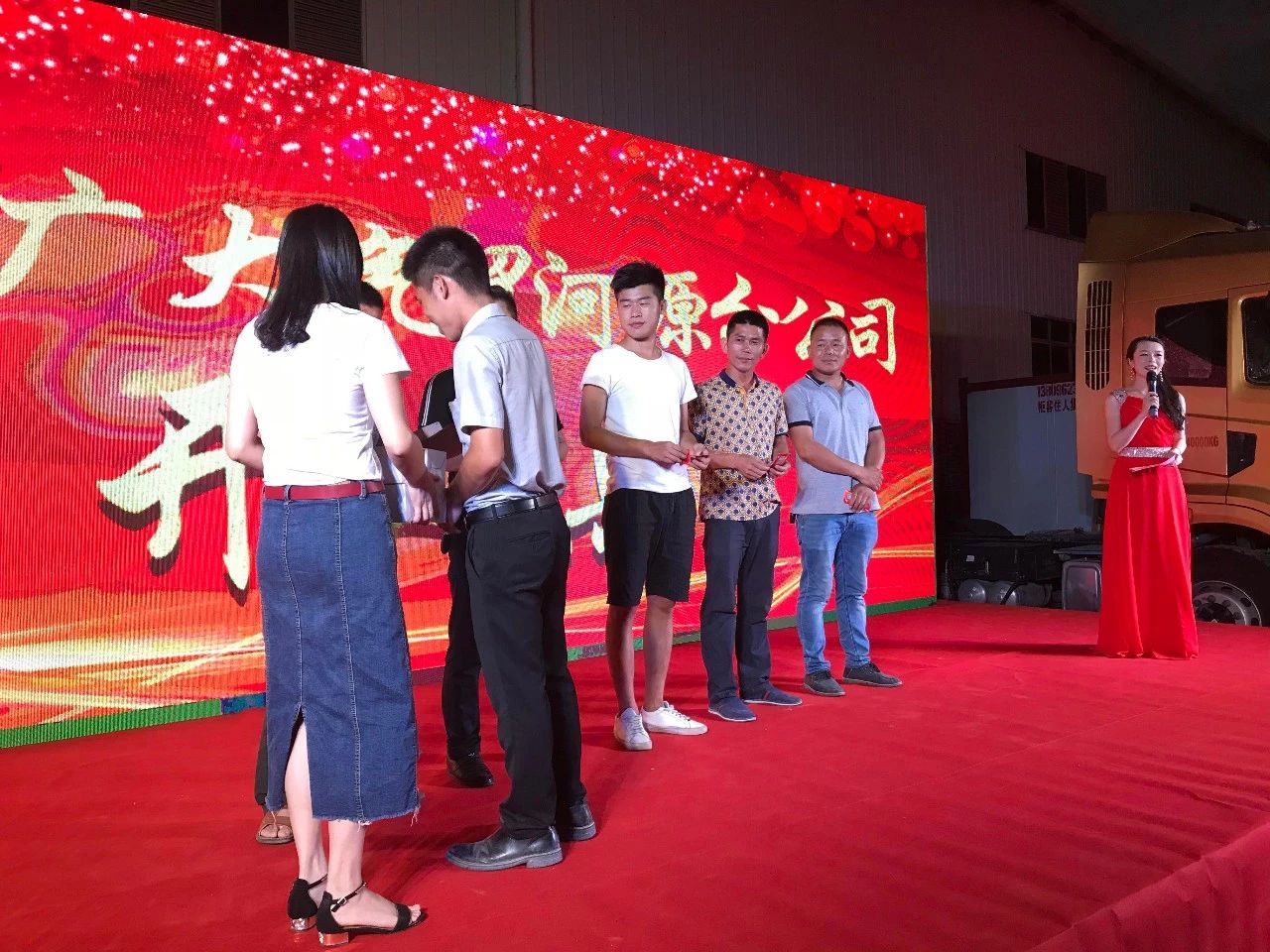 精彩紛呈的舞蹈過后,進入了第一輪的抽獎環(huán)節(jié),河源分公司銷售經(jīng)理劉恒霖先生為5位三等獎獲獎客戶頒發(fā)禮品。