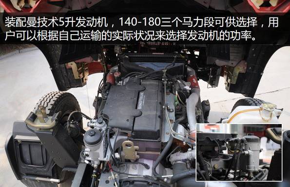 發(fā)動機為中國重汽引進德國曼技術(shù)生產(chǎn)的MC05發(fā)動,并且提供140、160、180三個馬力段供用戶選擇。