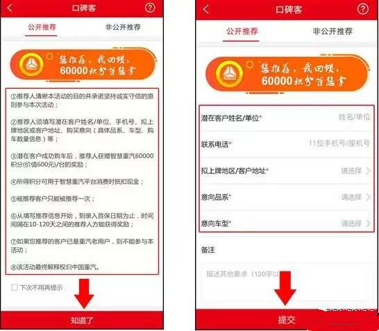 掃描二維碼下載“智慧重汽”APP,點擊“口碑客”功能模塊,按照要求填寫客戶信息。